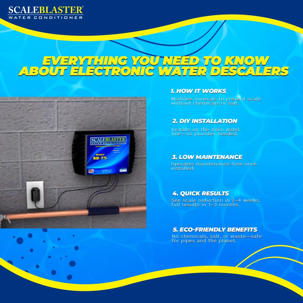 - Electronic water descalers, like ScaleBlaster, modify mineral properties to prevent scale buildup without chemical use.
